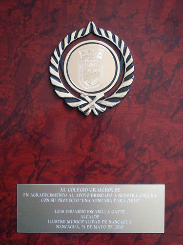 El Alcalde Eduardo Escanilla entrega una linda plaqueta con inscripción al Colegio Craighouse, representado por la familia van Lookeren-Harrison.